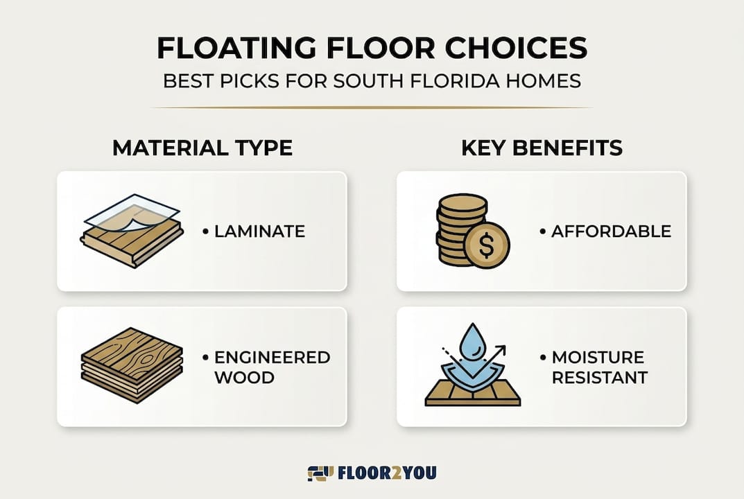 Not every floating floor material is created equal, and South Florida's humidity makes material selection critical. Choosing the wrong product can lead to swollen edges, warped planks, and floors that need replacing far sooner than expected.