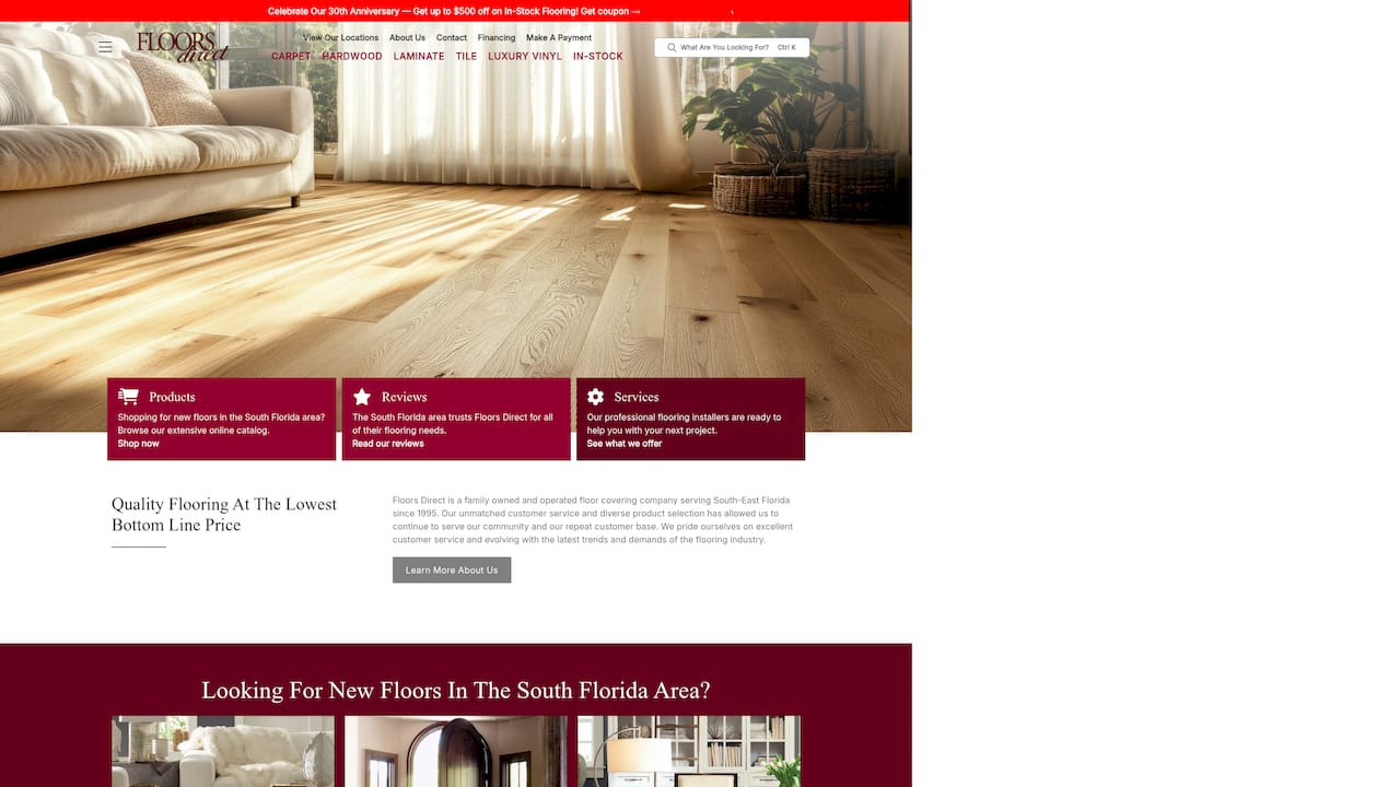 Floors Direct is a family owned flooring company serving Southeast Florida since 1995 with a broad product selection and local installation services. Bottom line: reliable local expertise with strong inventory but limited online clarity on pricing and links.