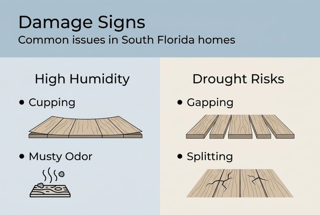 South Florida sits in a humid subtropical zone, which means average humidity levels routinely climb above 70% outdoors. When that moisture seeps indoors, wood absorbs it. Because wood is a natural material, it expands when wet and contracts when dry. In a climate with dramatic swings between air-conditioned interiors and steamy outdoor air, your floors are constantly moving in ways you can't see.