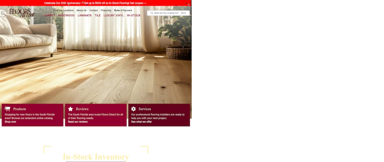 Floors Direct Inc. is a family owned flooring retailer serving South-East Florida since 1995 with a focus on quick availability and customer service. Their long local track record and in-stock promotions make them a practical choice for homeowners needing fast turnaround.