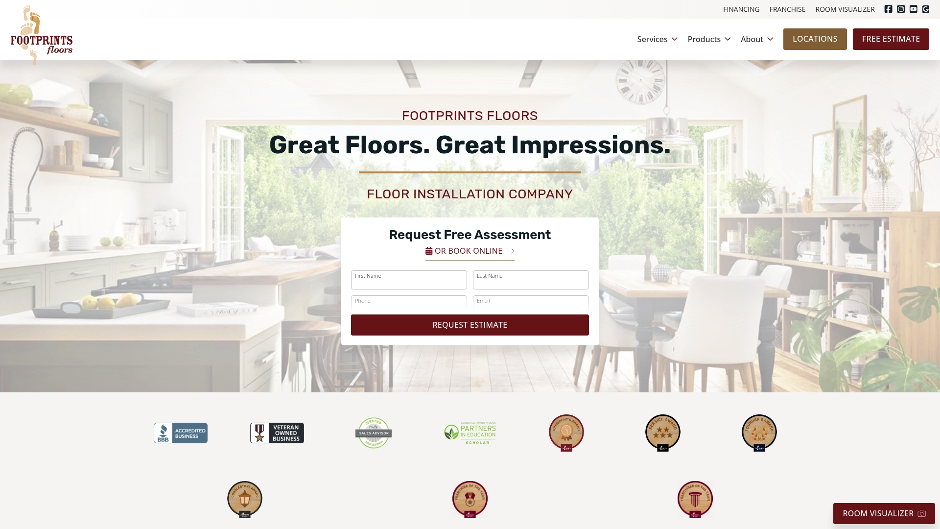 Footprints Floors offers a wide range of flooring services including hardwood, tile, vinyl, laminate, stone, and stairs installation along with specialized restoration and refinishing. They provide in home consultation and free estimates, use exclusive options from Revel Woods and Loba Home, and offer design help via their Room Visualizer.
